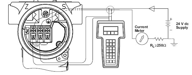 Connect the bench equipment as shown in Figure, and turn on the HART-based communicator by pressing the ON/OFF key. The communicator will search for a HART-compatible device and will indicate when the connection is made. If the communicator fails to connect, it will indicate that no device was found.